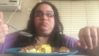 Breakfast mukbang grits, eggs, sausage links, hash browns (ice eating).